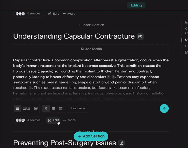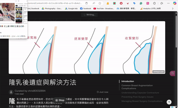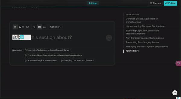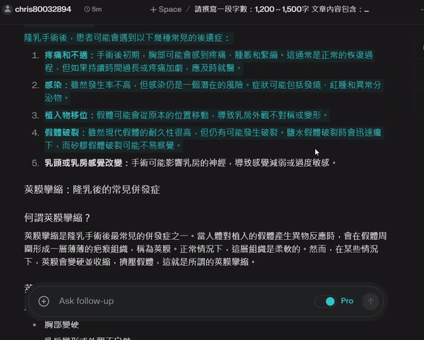 當這篇文章的目標關鍵字非常競爭、在排名前的文章字數都很多,perplexity 可以快速整理出絕大多數你必需要寫上的內容。以隆乳為例,我們可以跟 perplexity 說: